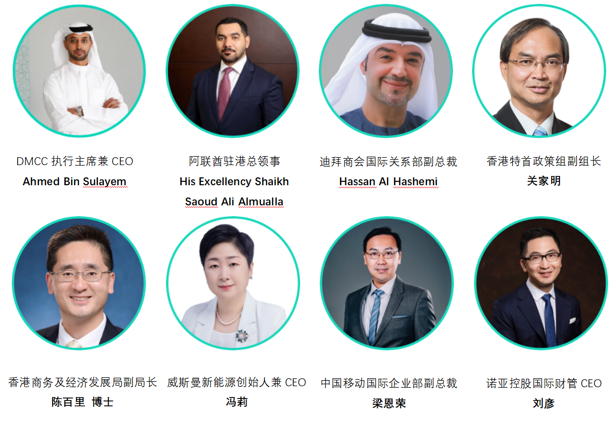 现场一同演讲致辞的嘉宾有DMCC执行主席兼CEO Ahmed Bin Sulayem,阿联酋驻港总领事His Excellency Shaikh Saoud Ali Almualla,迪拜商会国际关系部副总裁Hassan Al Hashemi,香港特首政策组副组长关家明,香港商务及经济发展局副局长陈百里博士,中国移动国际企业部副总裁梁恩荣,诺亚控股国际财管CEO刘彦,香港-中东经贸协会创会会长沈连龙,DMCC远东区域代表郭晓晰等。