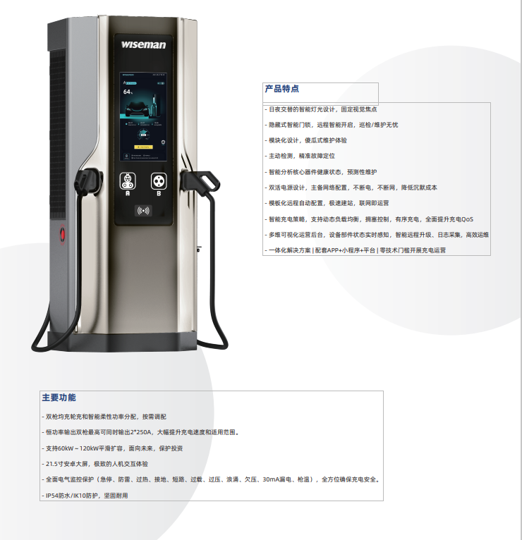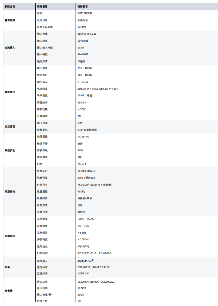 WM120CHN是一款全智能直流充电桩适用于集中式充电场站和高档建筑配套,可高效满足电动出租、电动网约车、电动物流车、电动乘用车、电动大巴等多样化的充电需求,满足所有符合国标的电动汽车安全高效充电,能为充电运营商提供高效经济、安全便捷的充电服务。